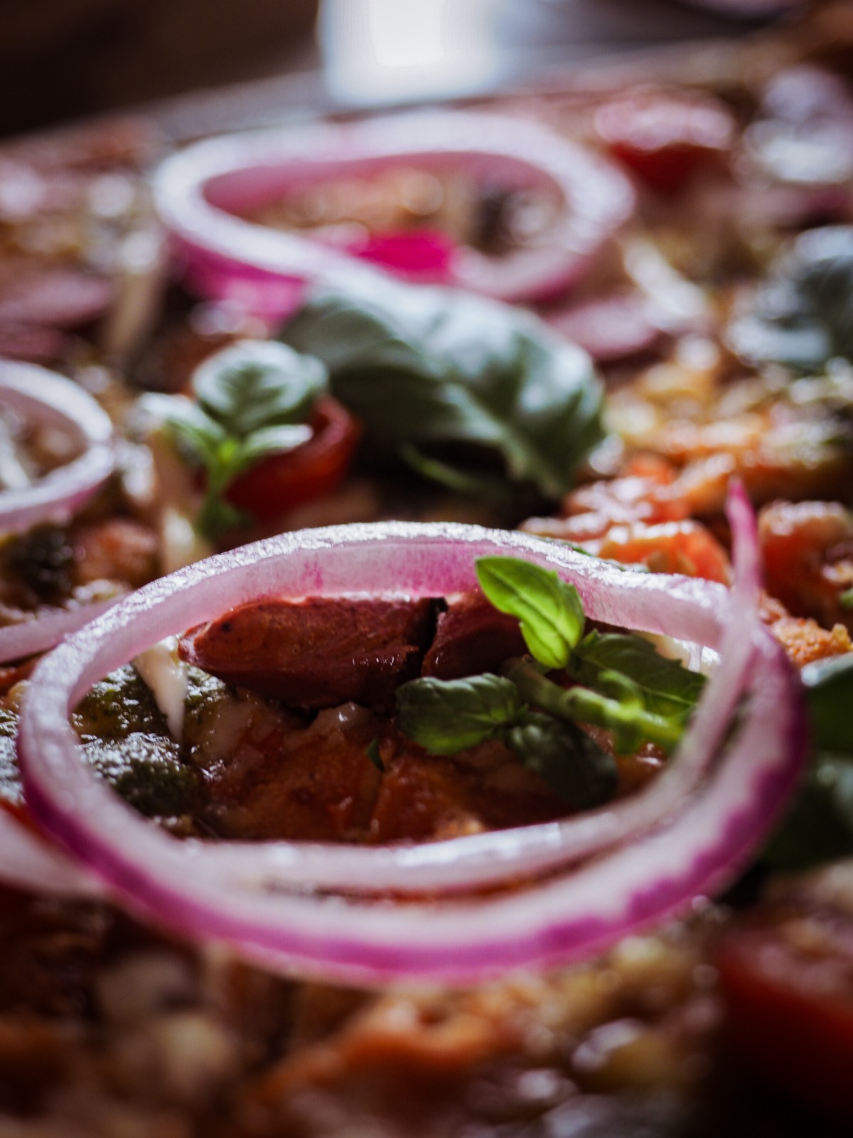 Taivas: Hiilillä grillattua kanaa, japaninruusukvitteni-kastike, mozzarellaa, aurajuustoa, kirsikkatomaattia